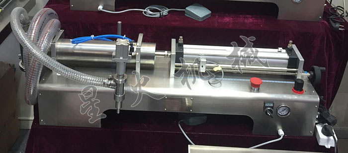 灌裝機(jī)為半自動活塞式灌裝機(jī)。通過氣缸帶動一個活塞來抽取和打出物料用單向閥控制物料流向,用磁簧開關(guān)控制氣缸的行程,即可調(diào)節(jié)灌裝量。