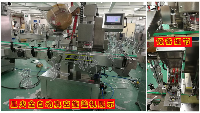 全自動真空旋蓋機采用自動抽真空旋蓋于一體,具有自動化程度高的特點,通過plc(可編程控制器)編程實現(xiàn)自動進出罐、自動配蓋、抽真空、夾緊瓶身、旋蓋等動作。采用密封效果佳的真空室結(jié)構(gòu),可以做到零泄漏,因此配置小功率的真空泵即能實現(xiàn)極高的抽真空效果;適用于多種圓形瓶子旋蓋。